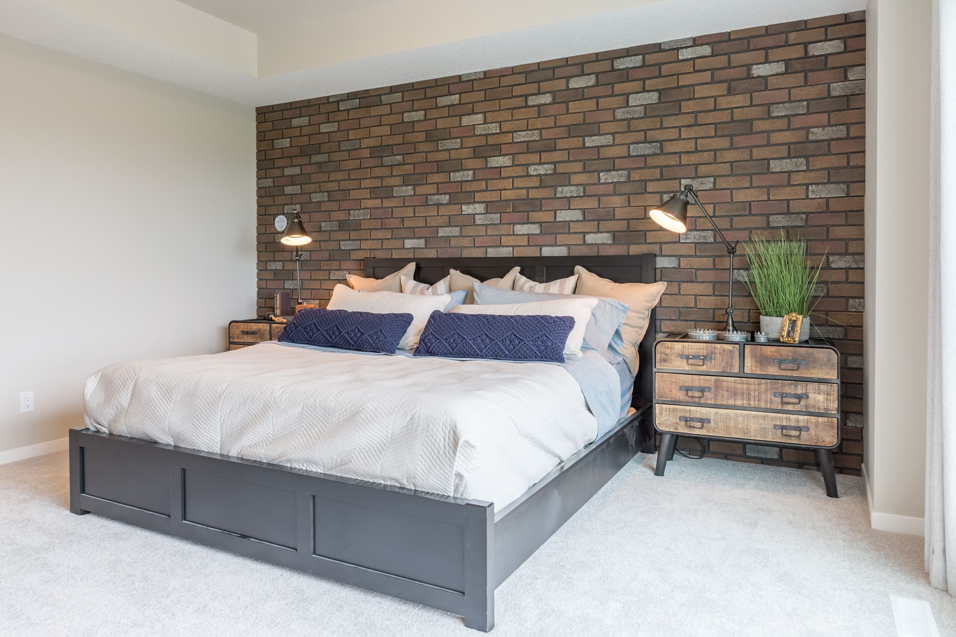 In our Kalos show home in Mahogany we whipped up a warm bedroom space, loaded with historical charm, with a brick feature wall as the main act. Check out how we created this rich and authentic look.
