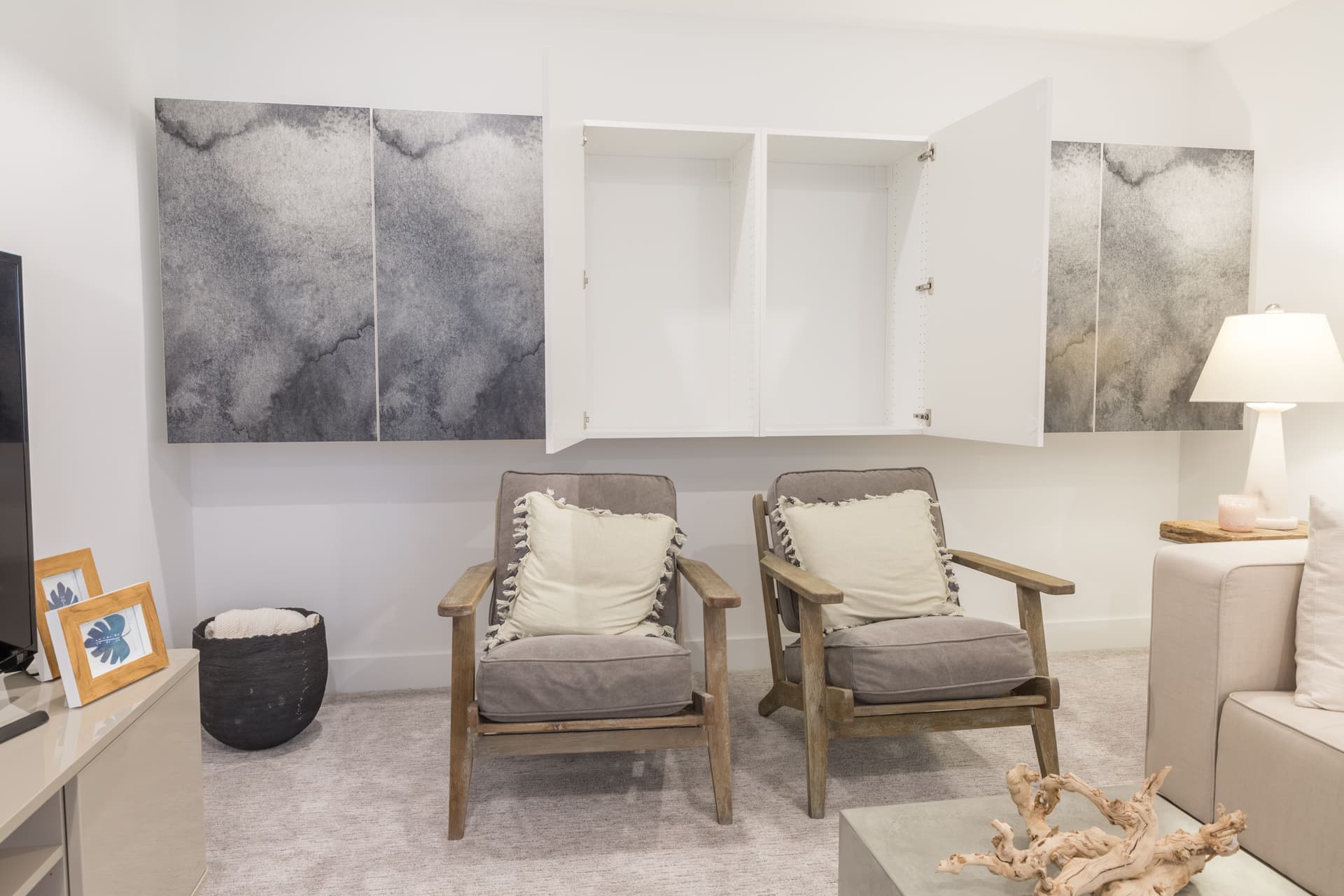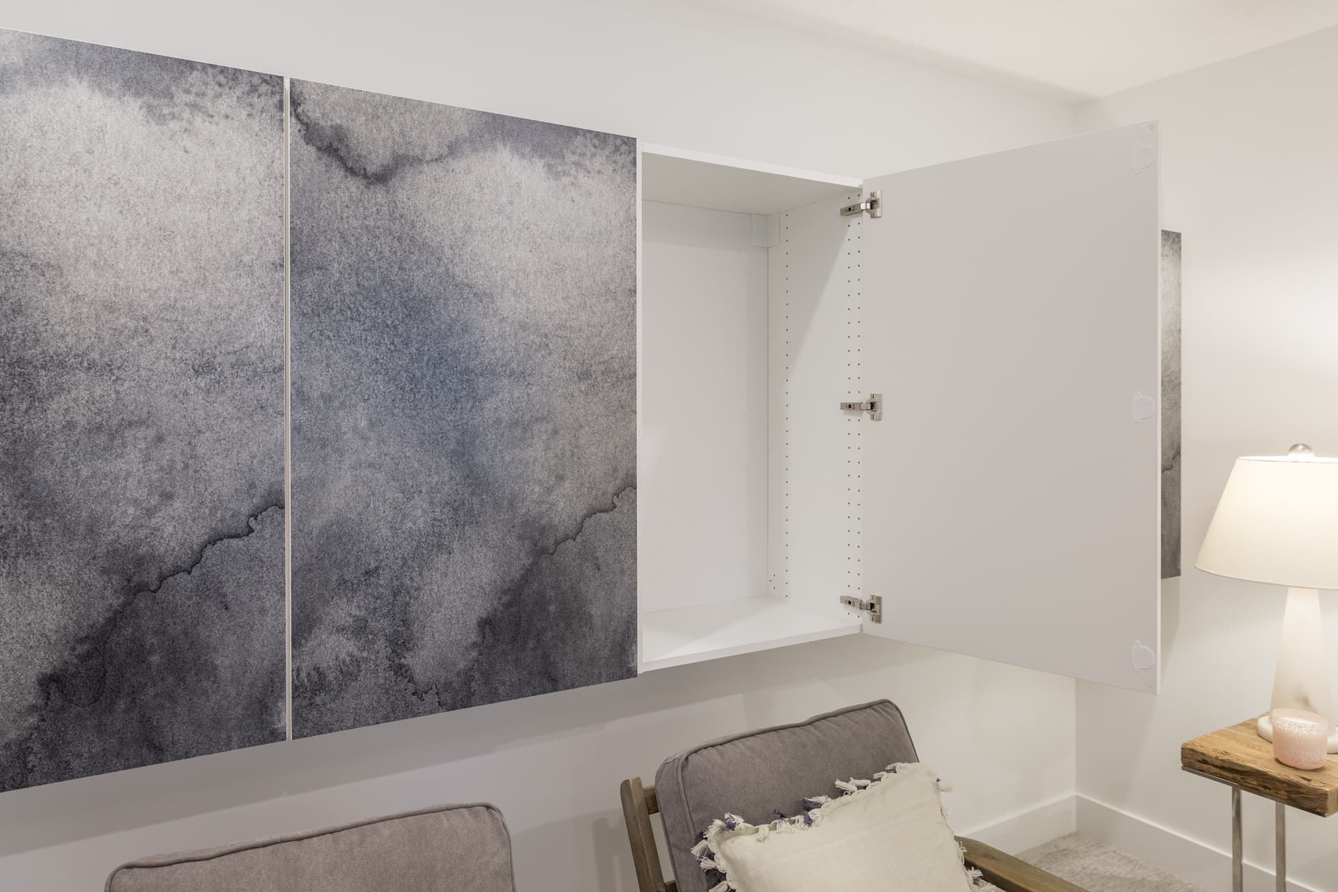 - Enjoy. And, last but not least, gather up all of the clutter, open the cabinetry doors and store it all inside. Close the door, and presto, all you will see is a beautiful artistic wall design.